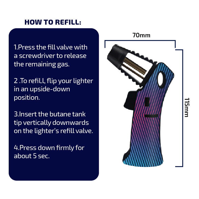 - Refill recommended with butane Africa Flame/Flame Club lighters gas