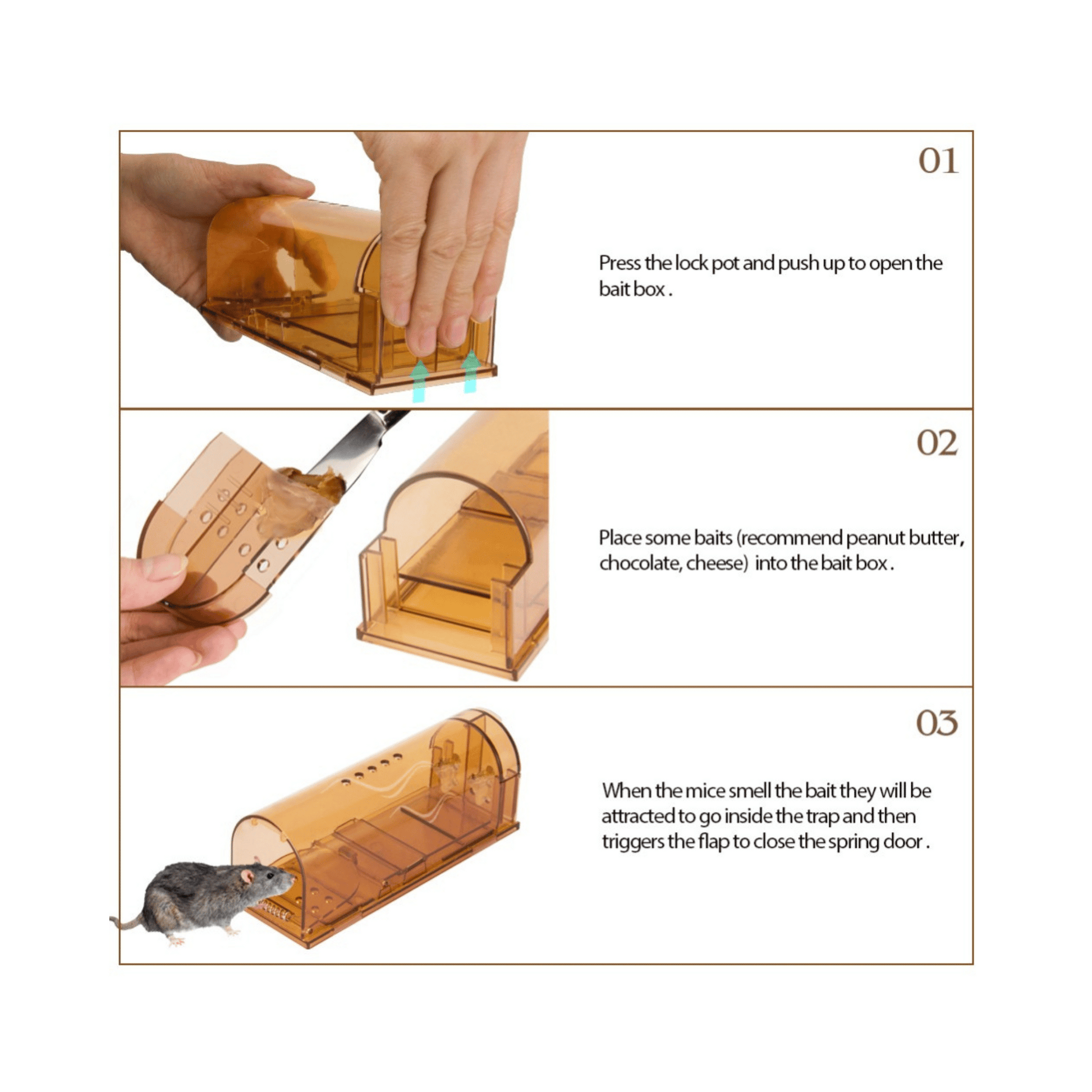 Our traps are made of plastic, so they won't hurt the animals or you.